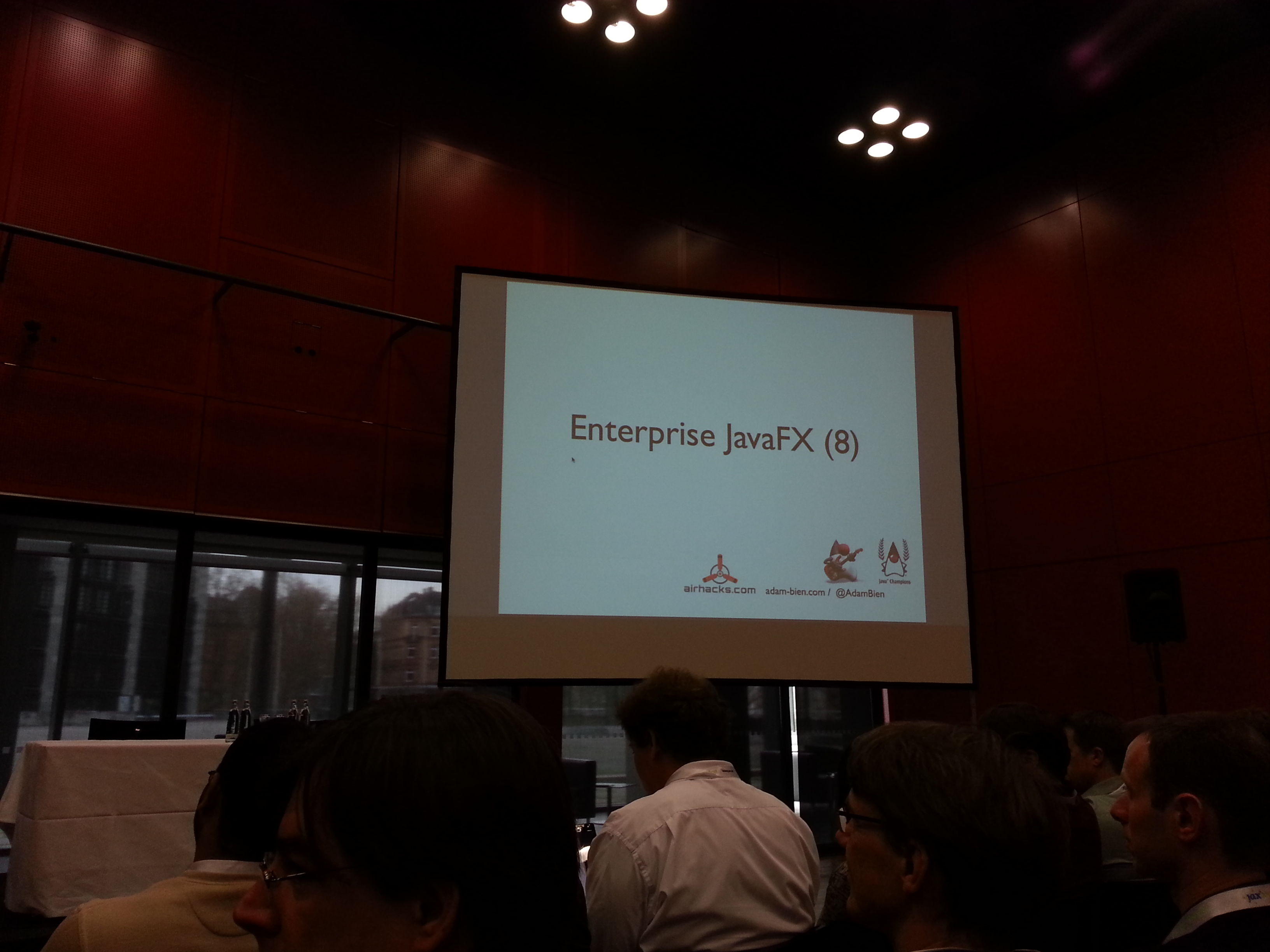 Natürlich habe ich mir auch ein paar Aufzeichnungen gemacht. So bevorzugt Herr Bien den FXML-Ansatz, um JavaFX-Anwendungen zu bauen. Außerdem verwendet er diverse Bindings, um Events oder bestimmte UI-Elementeim Code zu verwenden. Die Inhalte wiederum werden bei dem FXML-Ansatz durch spezielle Propertys mit den Elementen verbunden. Generell meinte Herr Bien, dass man UI’s „nur“ mit dem Scene Builder von Oracle erstellen sollte, weil es einfacher und schneller geht. Des Weiteren zeigte Herr Bien einen interessanten Ansatz, um mit einer Factory die entsprechende FXML-Datei zu laden und sich das Modell per @Inject Annotation zu initiieren. Entsprechende Beispiele findet man auf seiner GitHub-Seite: