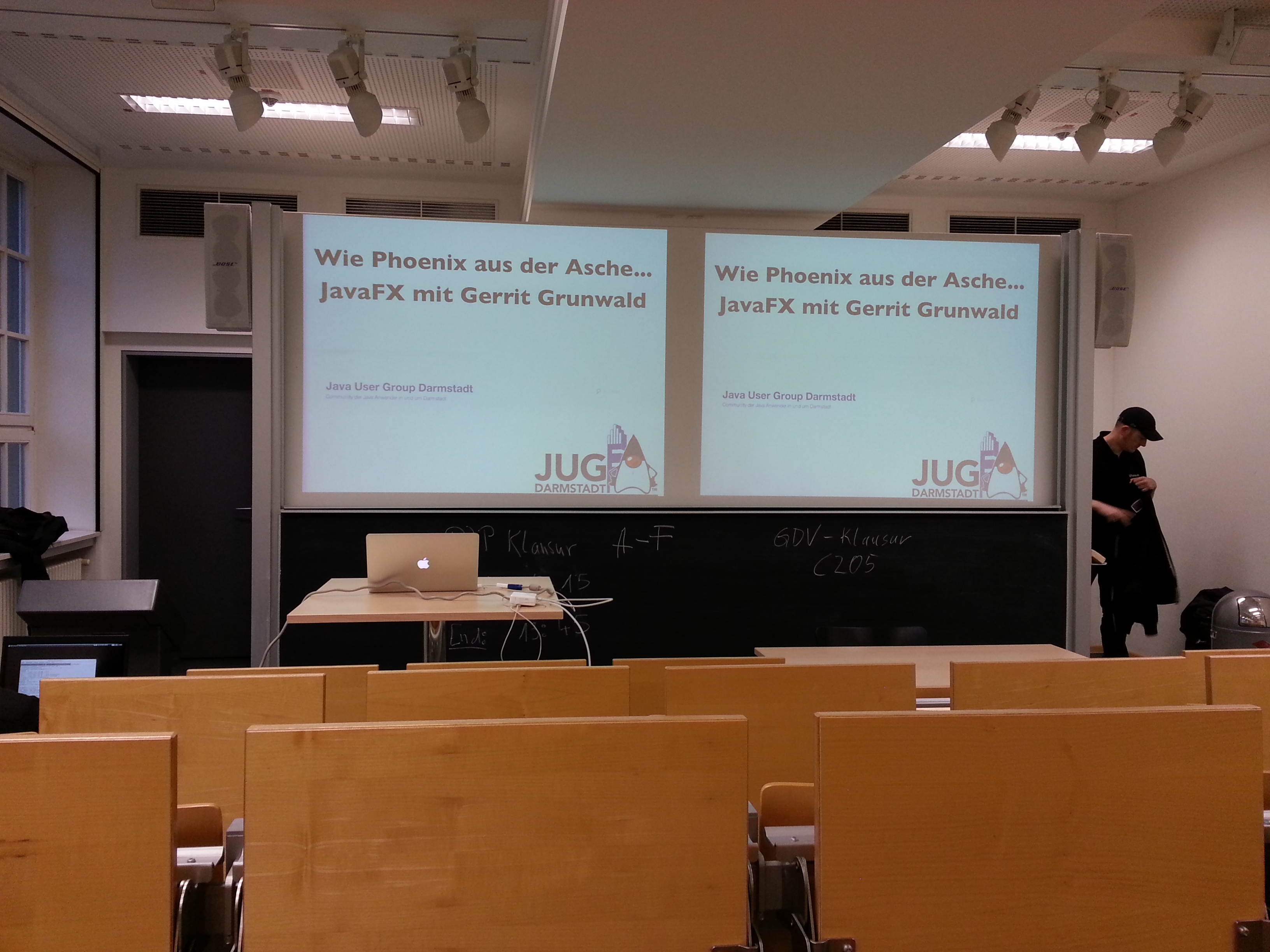 Smooth, easy und elegant präsentierte Gerrit Grunwald JavaFX beim Java-User-Group in Darmstadt. Mit dem provokanten Titel „Wie Phoenix aus der Asche…JavaFX 2.0 mit Gerrit Grunwald“ fesselte er 50 Teilnehmer über 90 Minuten lang;-)